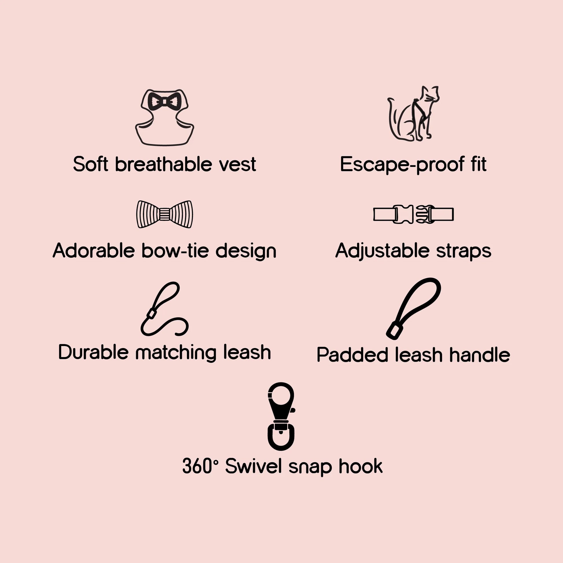 The BowHug Harness offers a soft, breathable, and escape-proof fit for your pet. Its adorable bow-tie design adds charm, while adjustable straps ensure comfort and safety. Paired with a durable leash and padded handle, it’s perfect for stylish, secure, and comfortable daily walks.