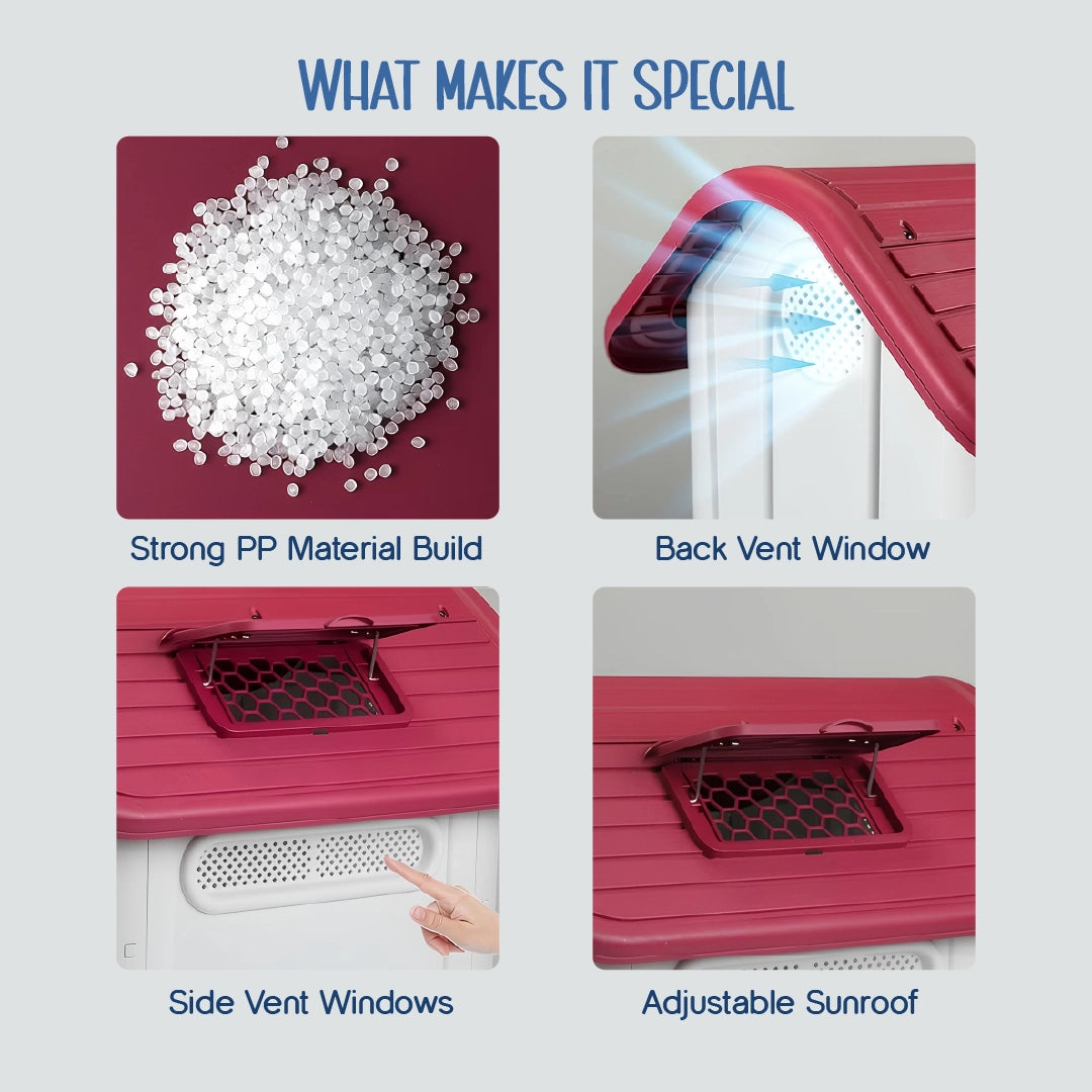 The Cuddle Den Pet House is designed to give your furry friend a safe, cozy, and weatherproof home—indoors or outdoors. Built with durable PP plastic, it offers year-round comfort with its elevated floor, adjustable sunroof, and side vent windows for airflow. Perfect for medium dogs up to 70 lbs, this pet house is quick to assemble, easy to maintain, and provides lasting protection. Whether in your backyard, patio, or on the go, give your pet the dream home they deserve.