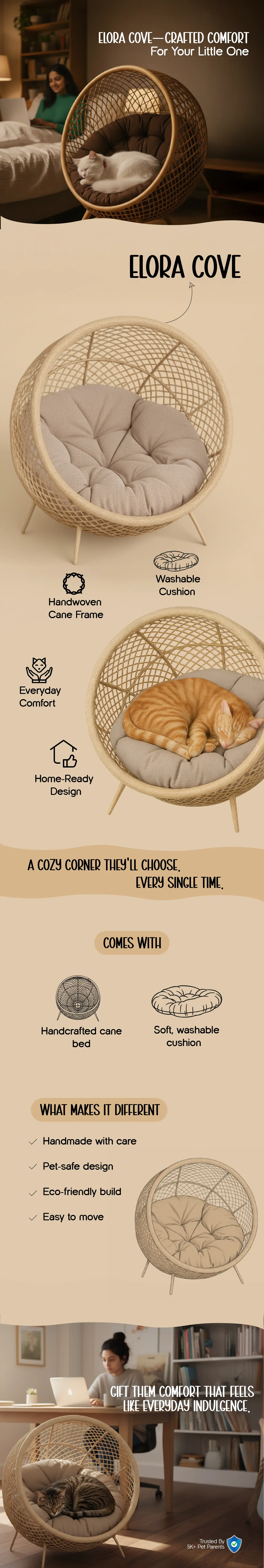 Elora Cove is a handwoven bed for cats and small dogs, offering a cozy space for naps and play. With a soft, washable cushion and lightweight, durable cane frame, it keeps pets comfortable, entertained, and relaxed while adding a stylish touch to your home.