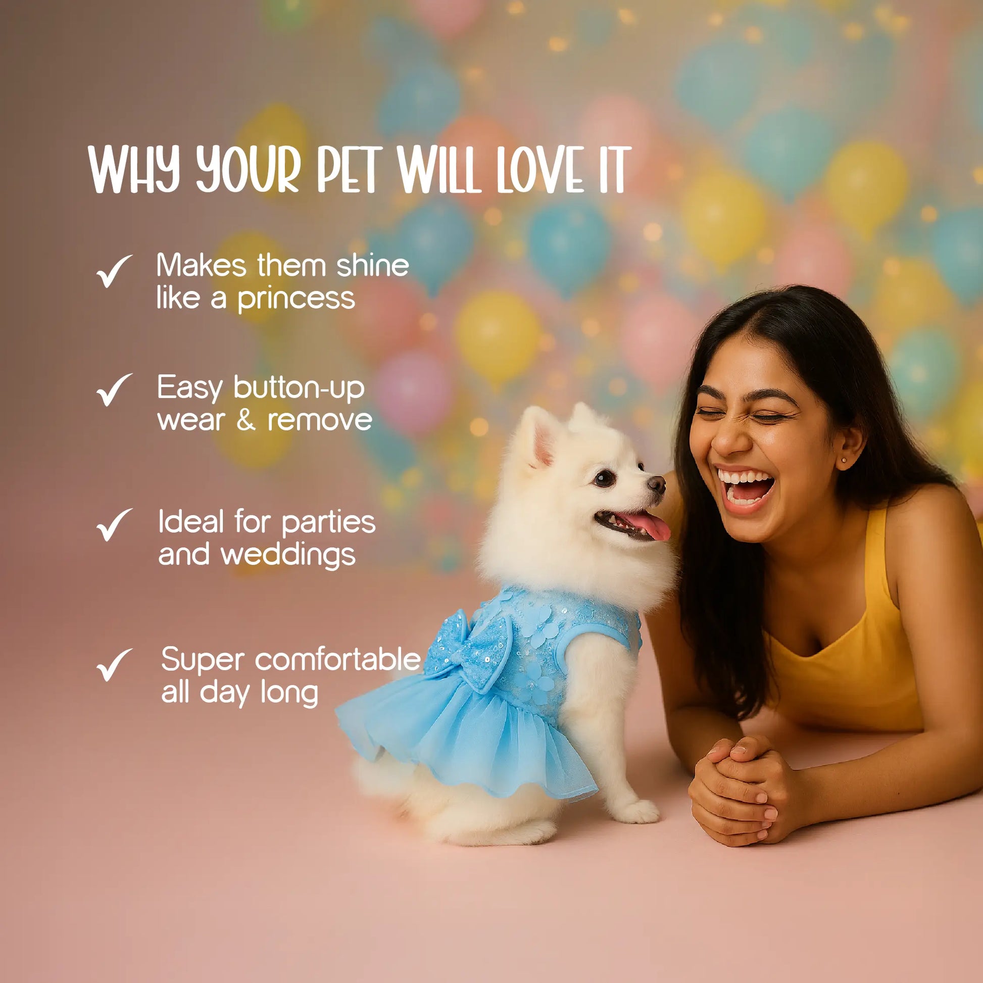 StarryBelle Dress combines dreamy charm with easy wear. Elegant bowknot, sparkling sequin mesh tutu, built-in D-ring, and button-up closure for comfort and style. Perfect for parties, weddings, and royal strolls.